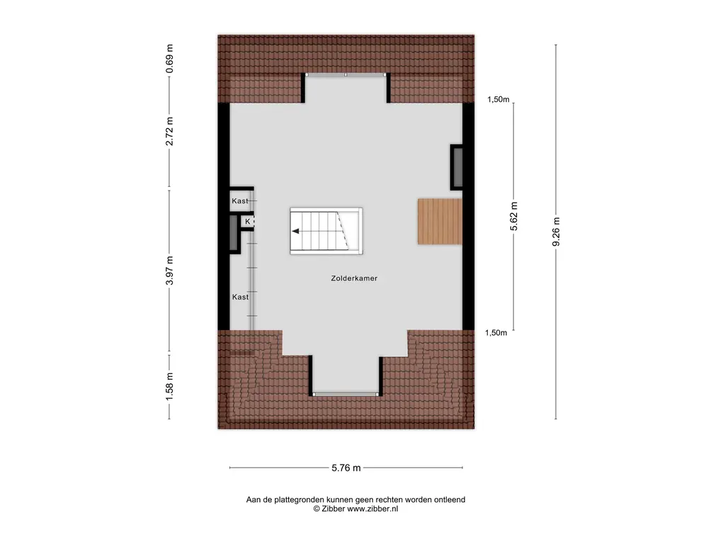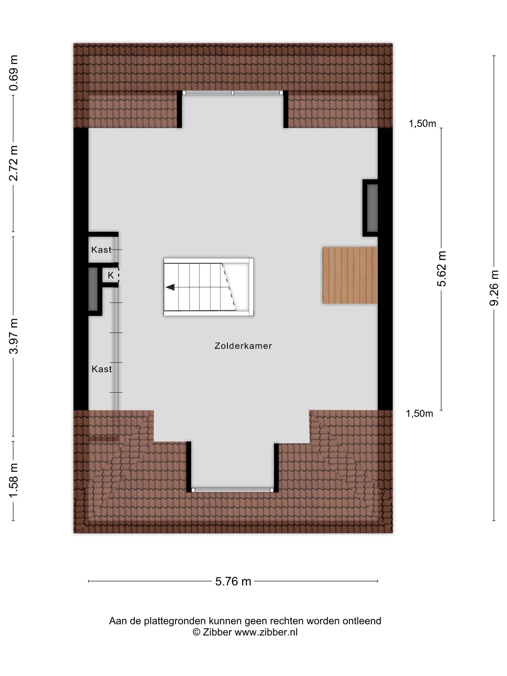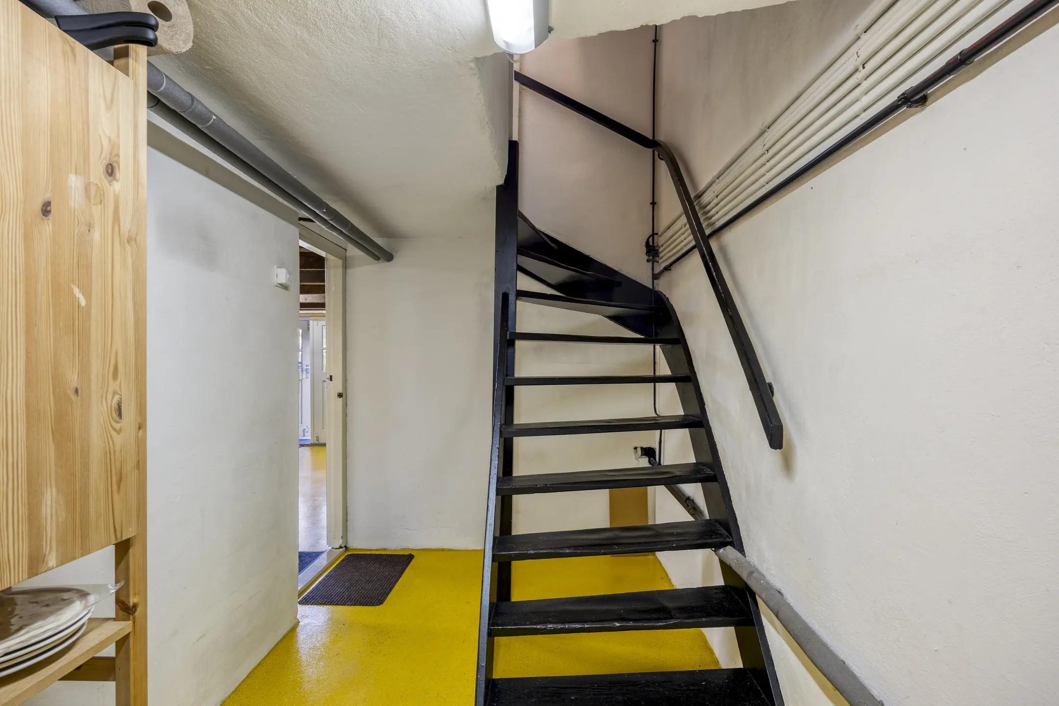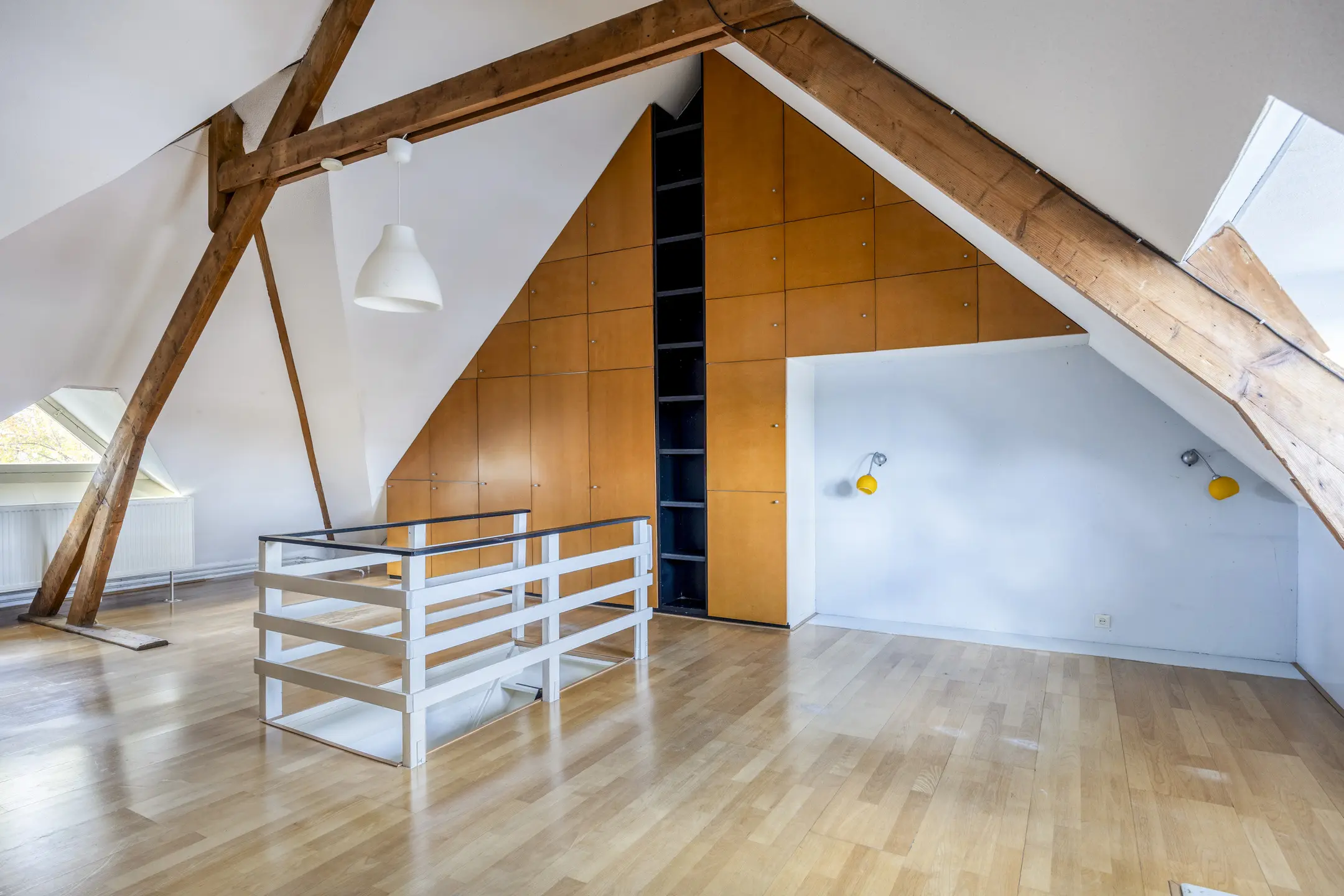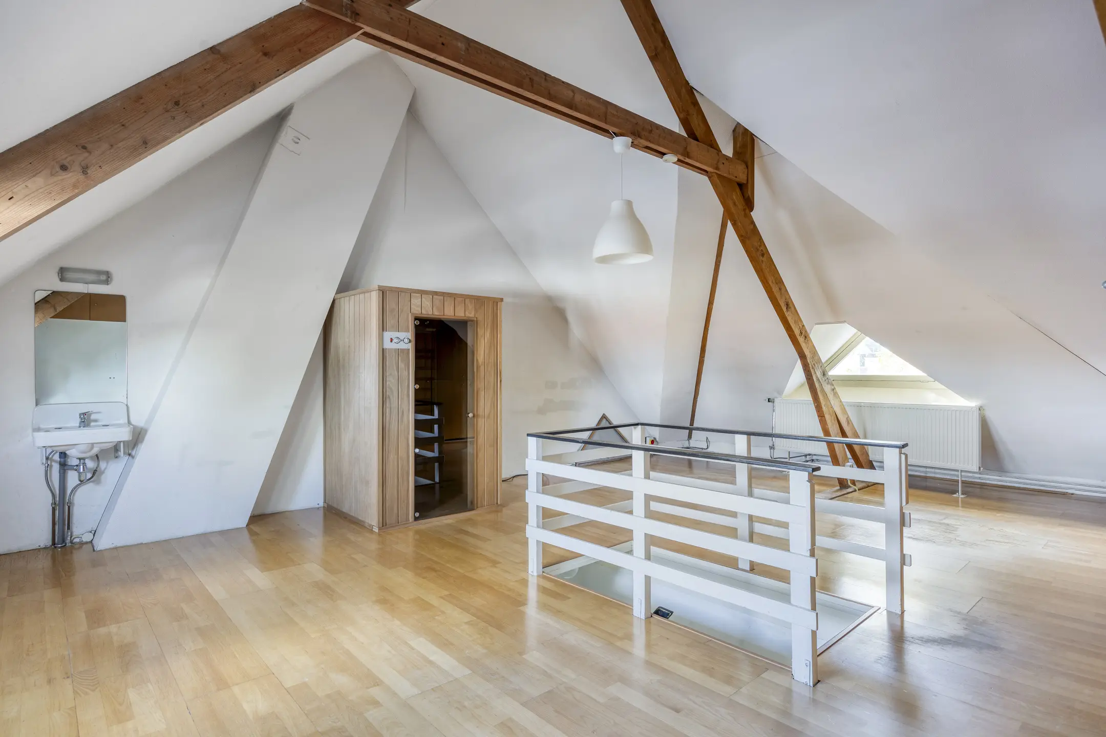 Open attic space with a very high ceiling and a charming exposed beam construction. The roof is fully insulated and features two original dormer windows. This space could potentially be divided into two additional (bed)rooms.