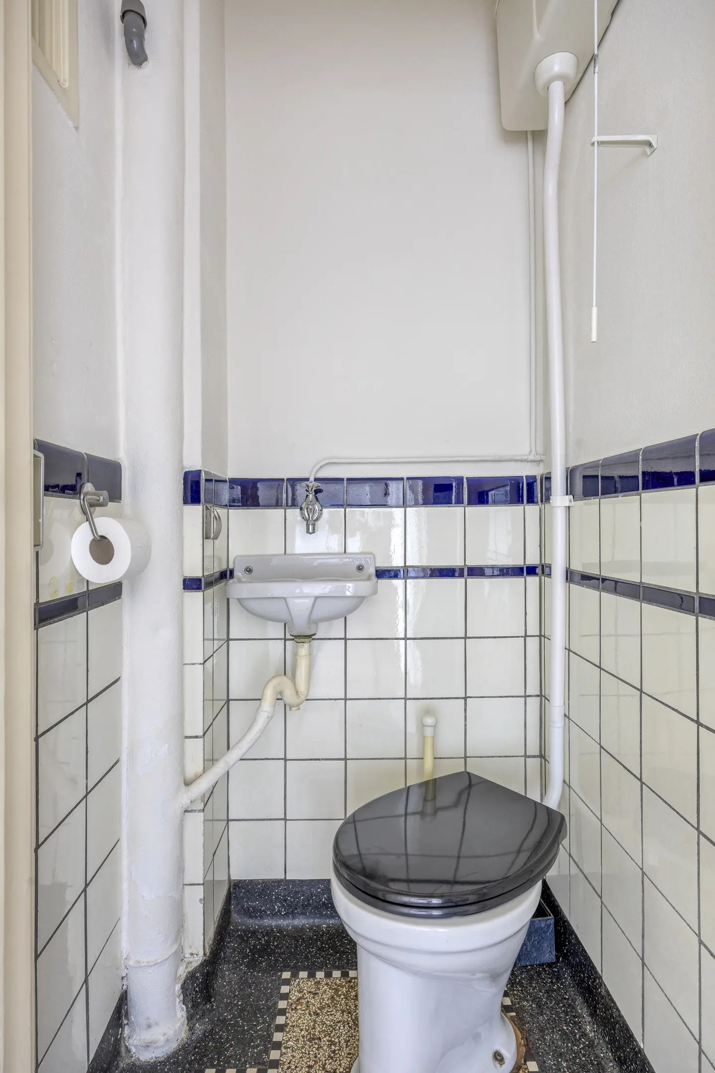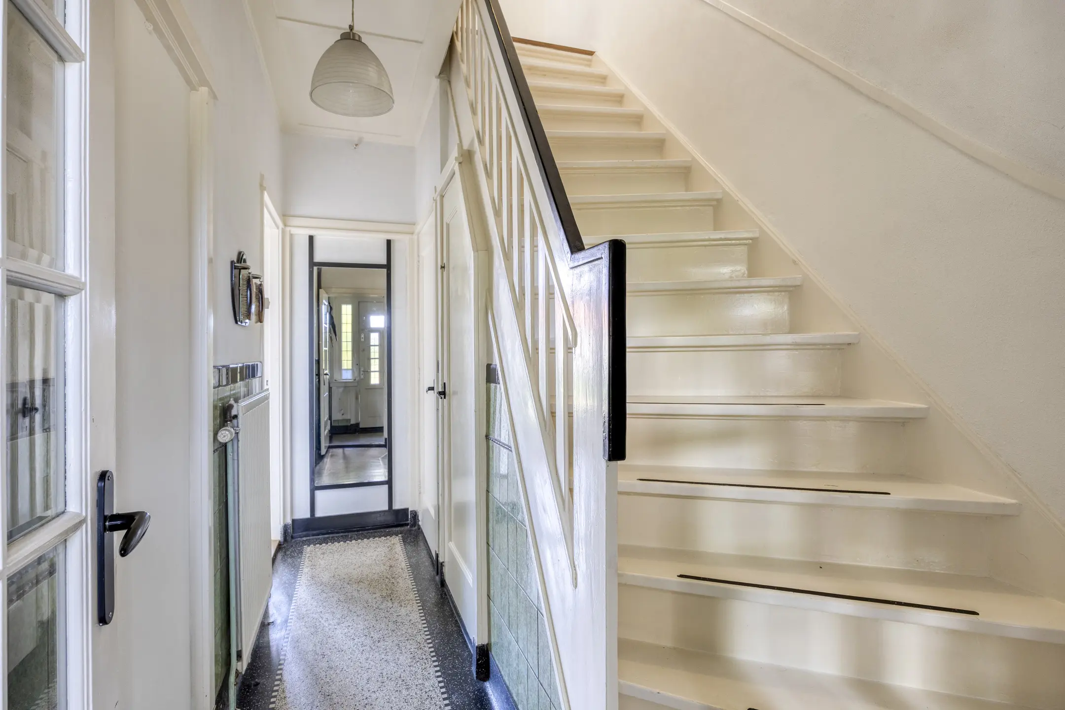 Uitnodigende chique jaren 30 entree/hal, originele granitovloer en wandtegelwerk, meterkast, trapopgang, trap naar het souterrain en toilet v.v. wandcloset met fontein.