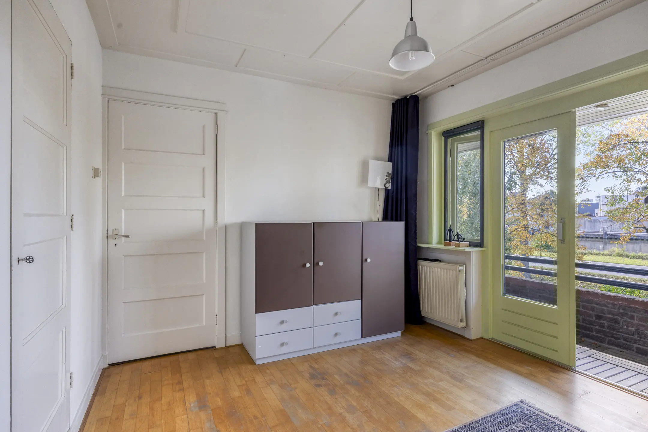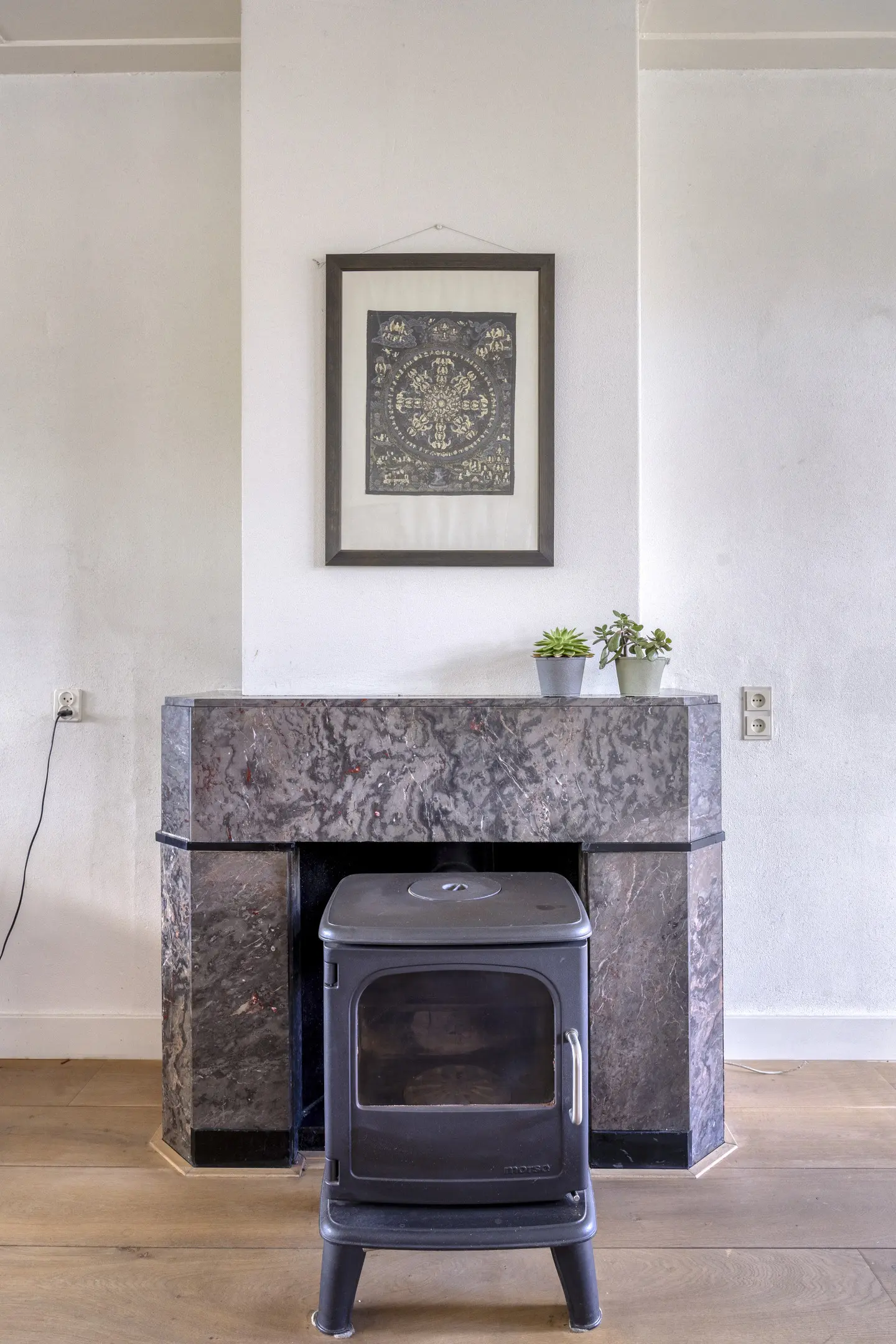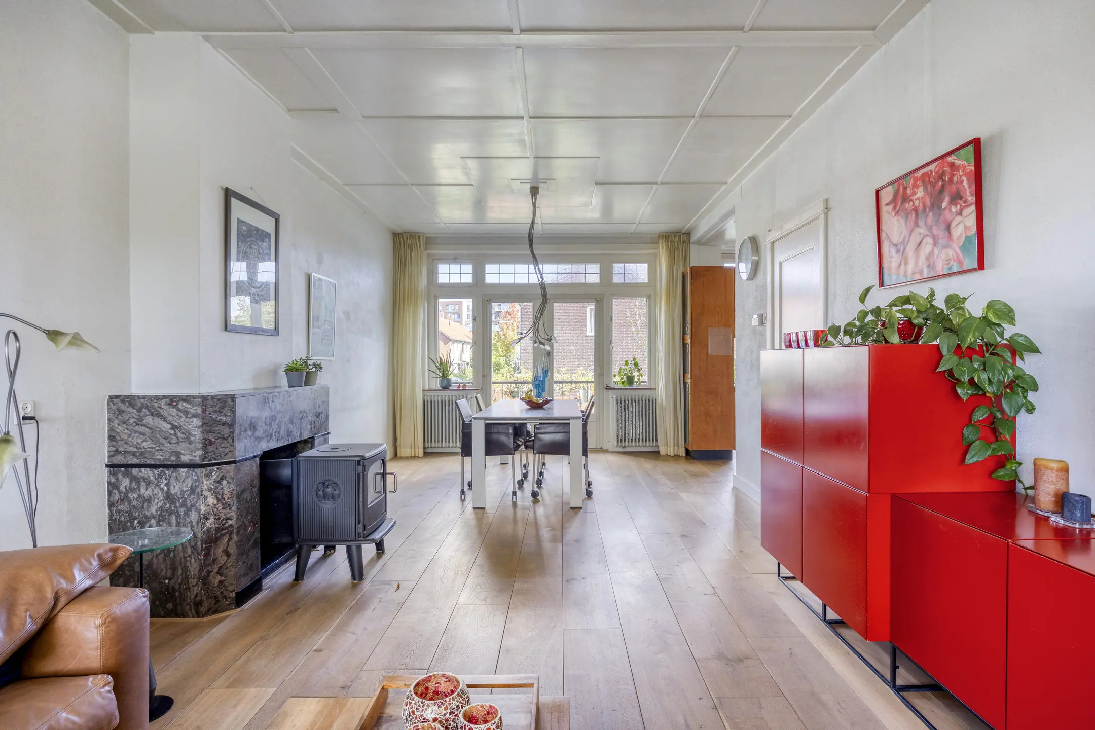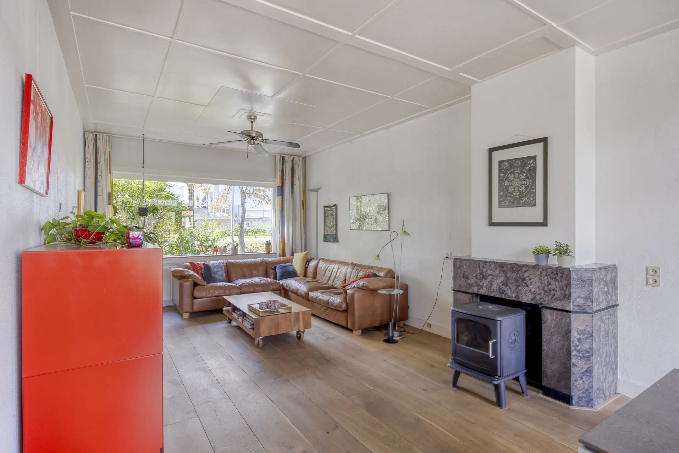 Access to the living room with lots of natural light (large windows) and unobstructed views of the Gouwe canal. Features include a fireplace with a natural stone finish, a beautiful oak wooden floor, and original details such as stained-glass upper windows.