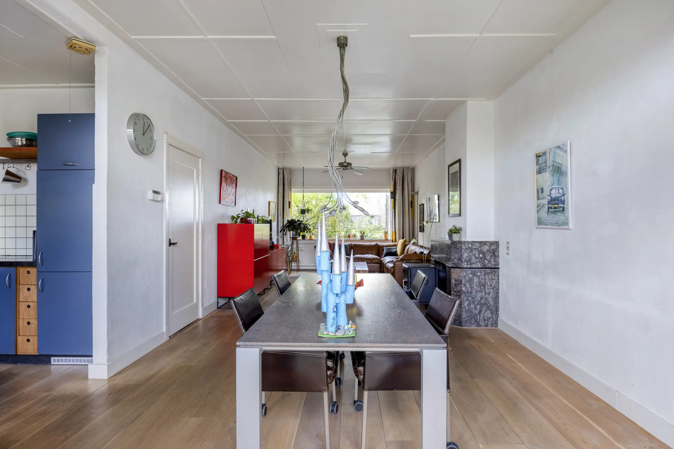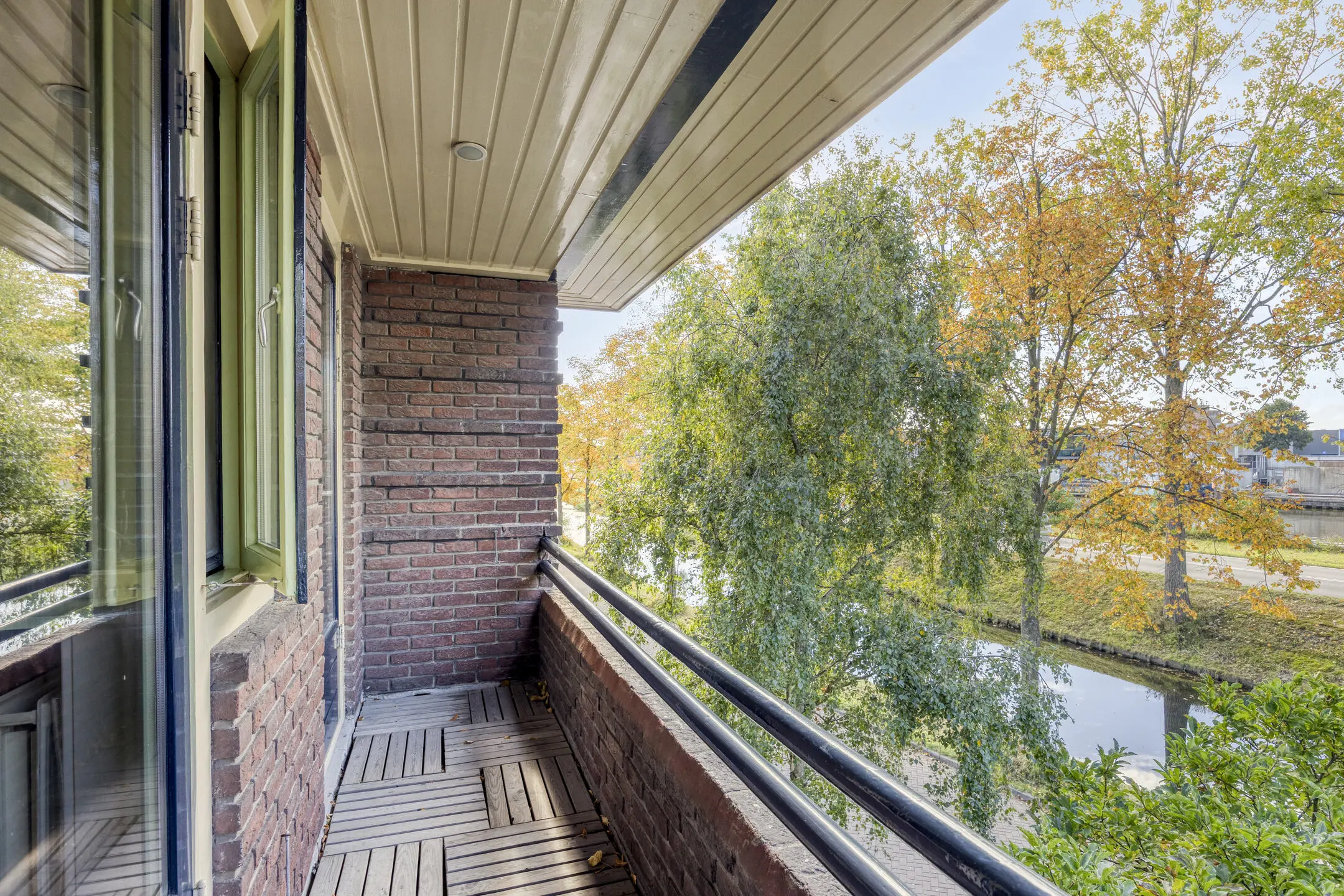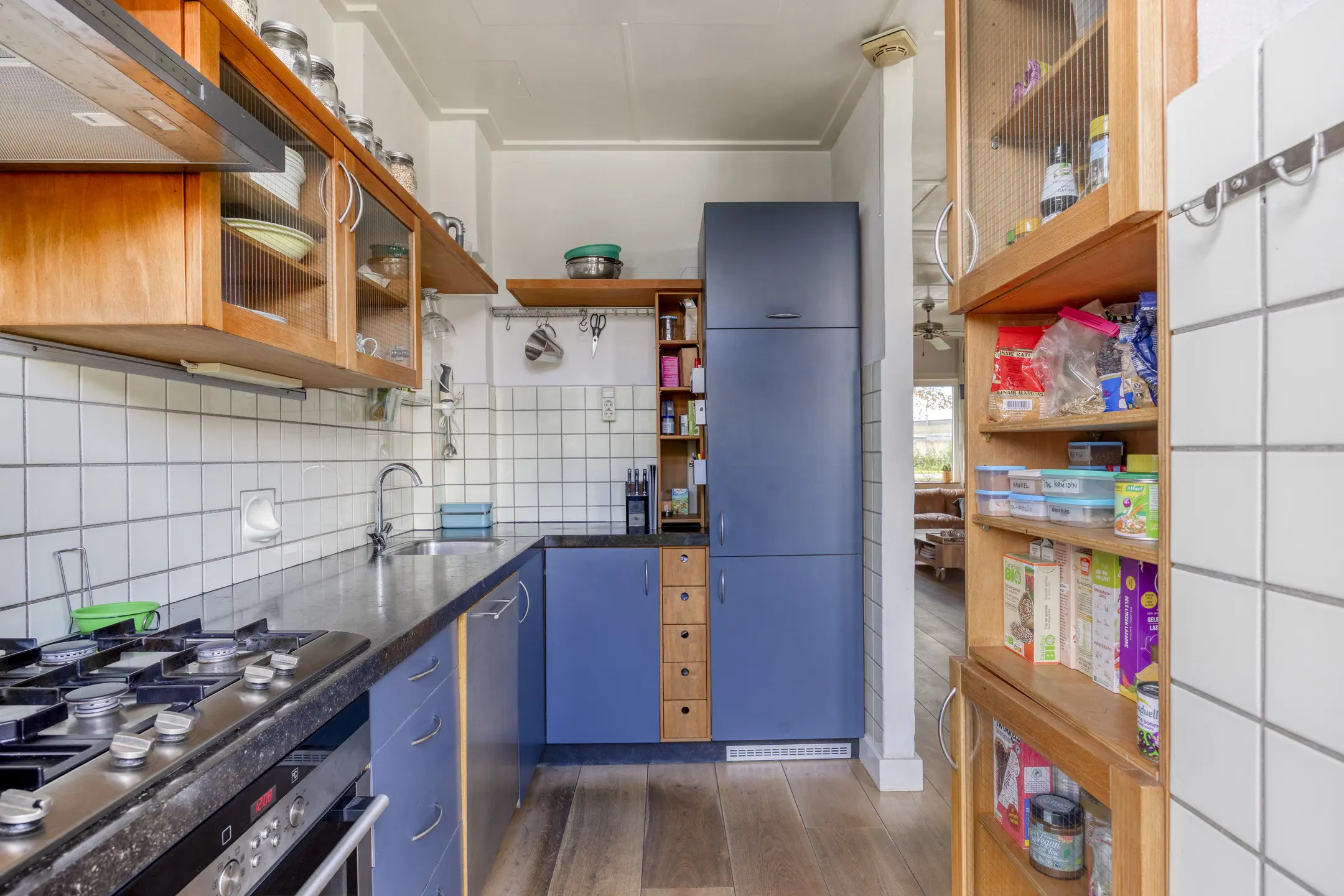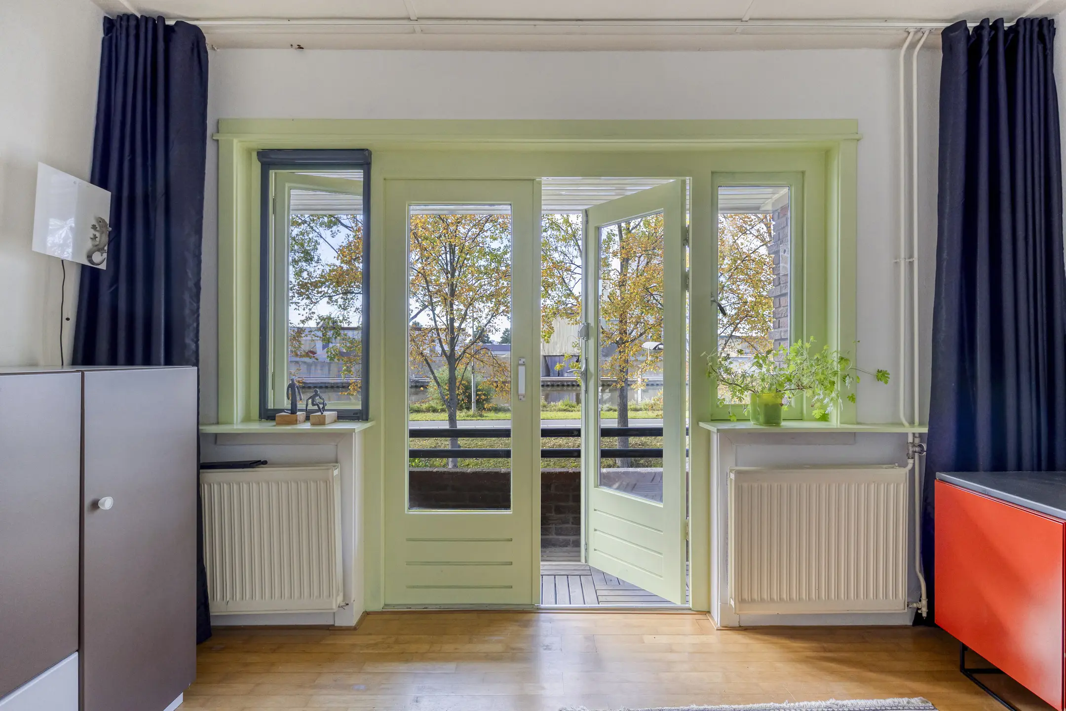 Toegang tot de woonkamer met veel lichtinval (grote raampartijen) en vrij uitzicht op de Gouwe. Voorzien van een haard met natuursteenafwerking en mooie eikenhoutenvloer en originele details waaronder glas in lood in de bovenlichten. Aan de achterzijde is de keuken (voorzien van inbouwapparatuur en granietenwerkblad) naderhand bijgetrokken bij de woonkamer wat een open en gezellig karakter geeft tijdens het koken/borrelen. Vanuit de achterzijde (via openslaande deuren en keukendeur) heeft u toegang tot het heerlijke achtergelegen balkon en heerlijke tuin met achterom en parkeerplaats gelegen op eigen grond.