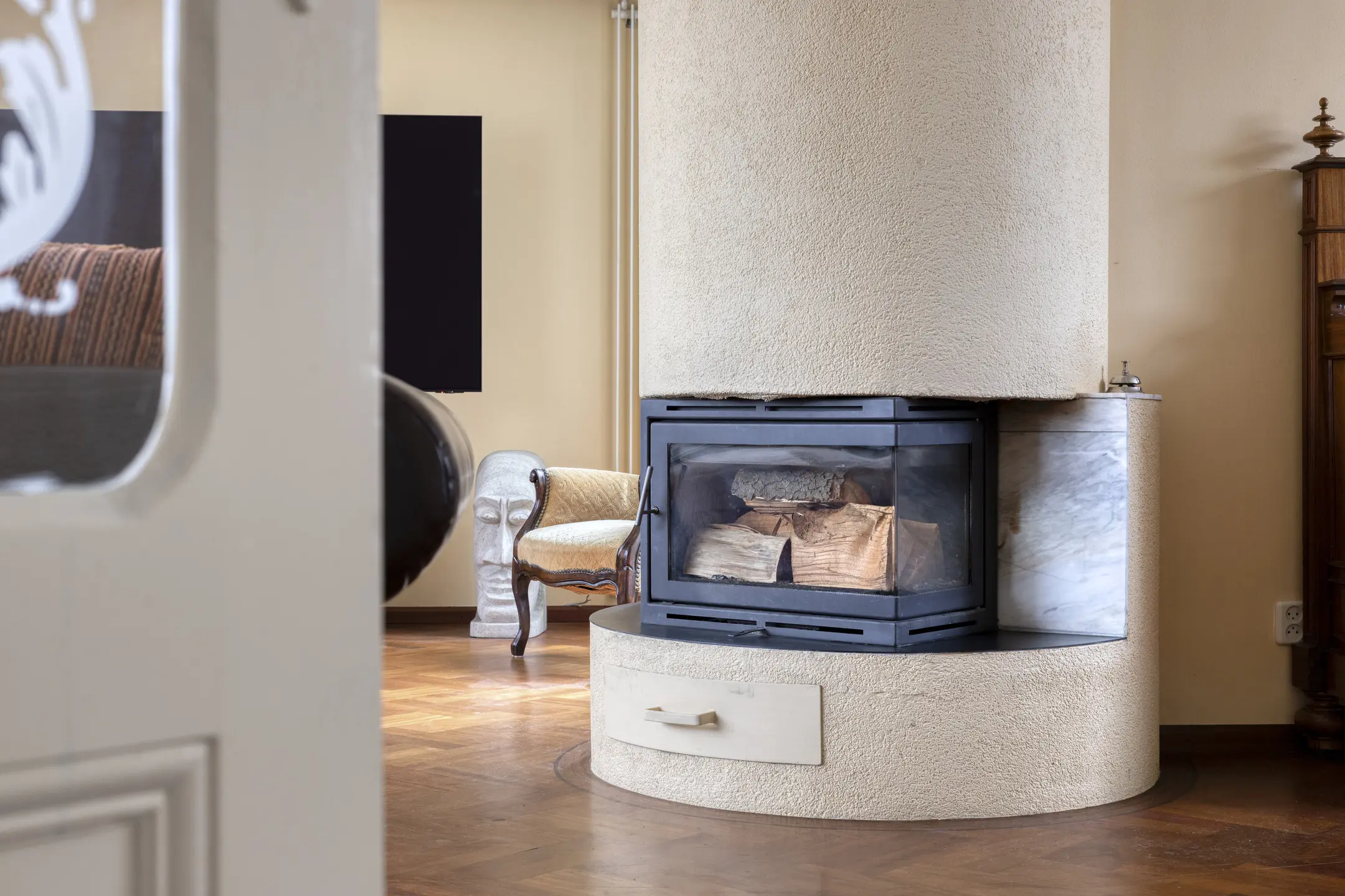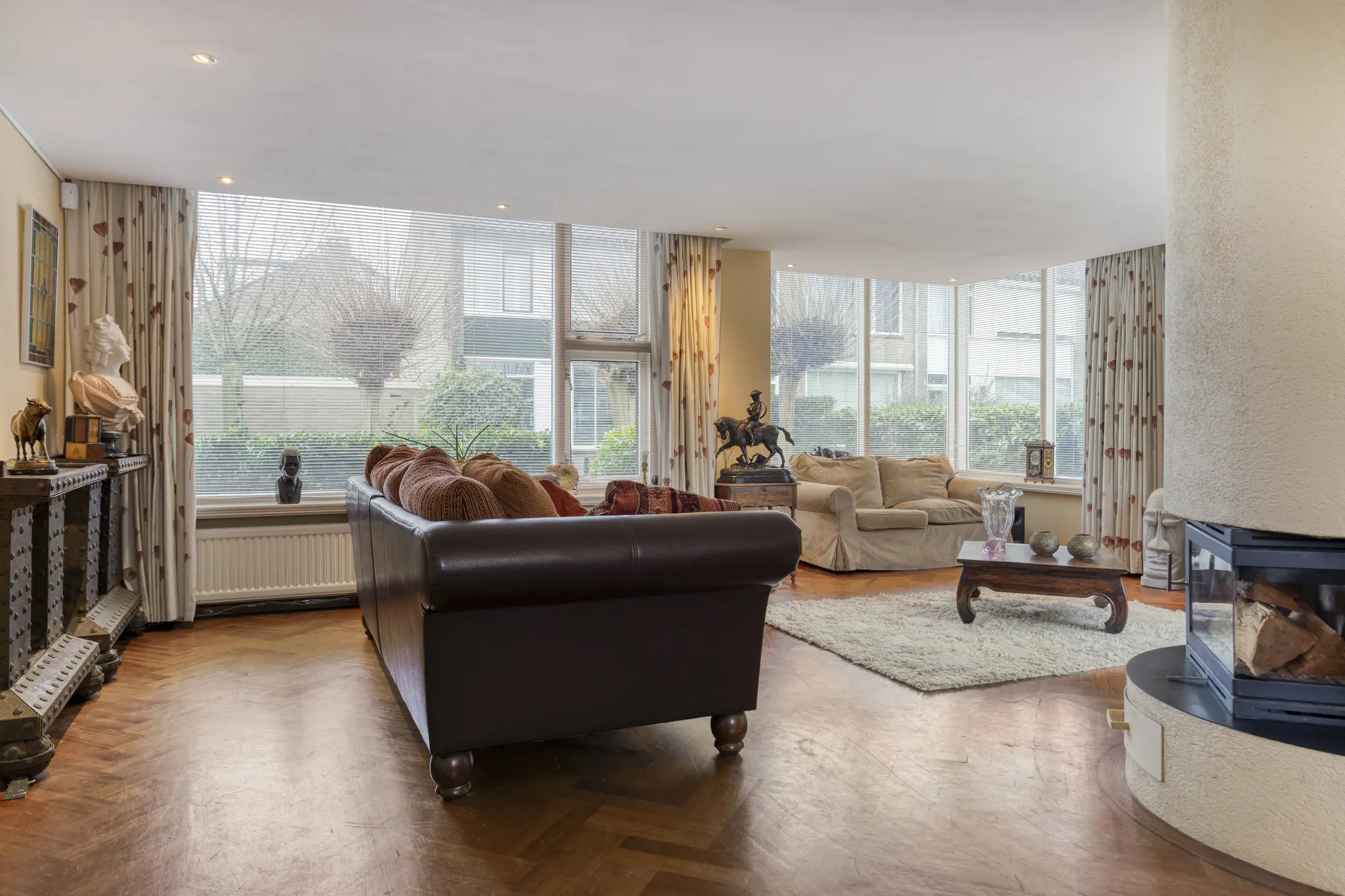 De lichte woonkamer met zij-uitbouw en speelse indeling is voorzien van warme hardhouten vloer uitgevoerd met mooie bies, inbouwverlichting en sfeervolle ‘hout knetterende’ open haard.