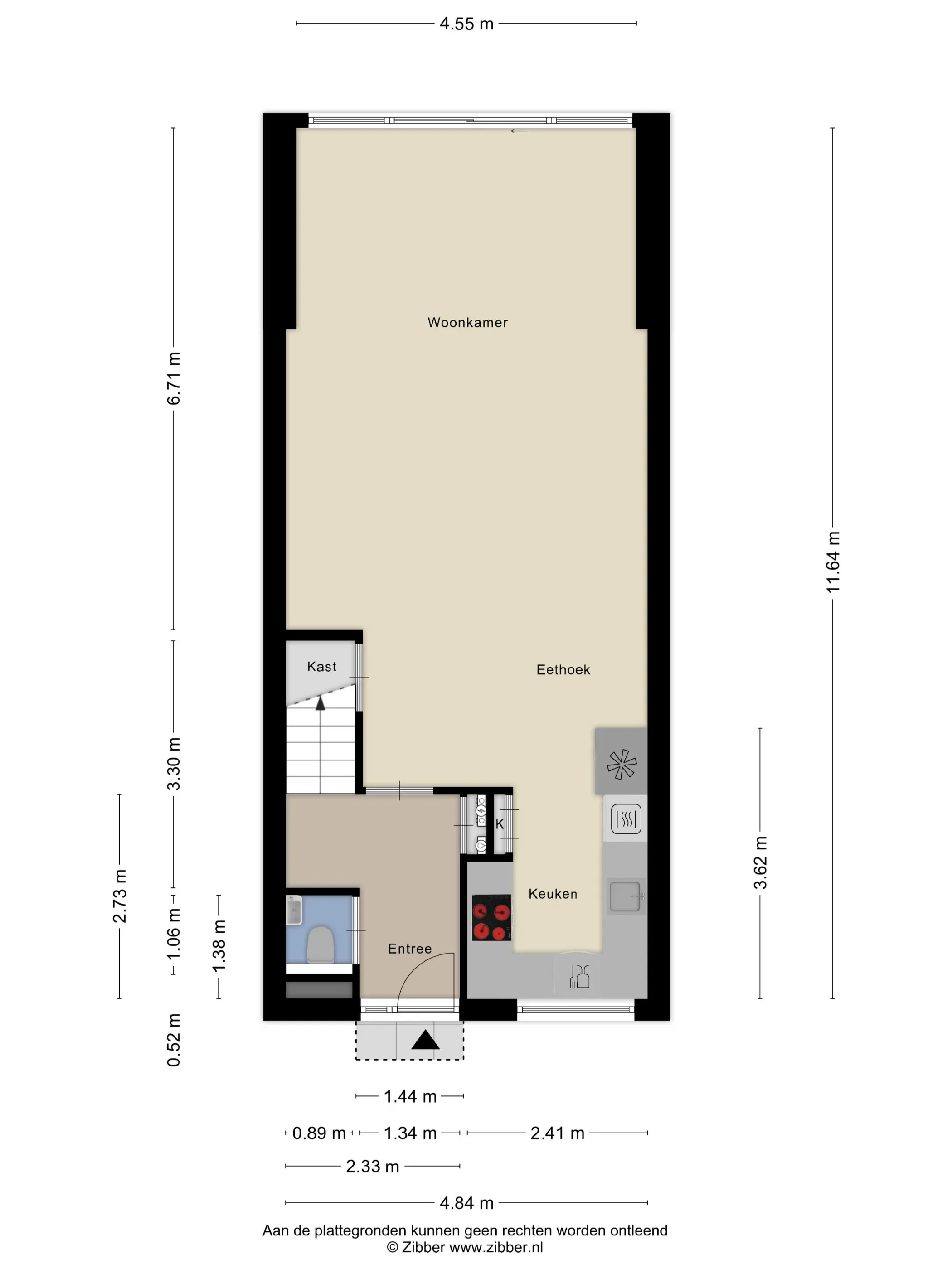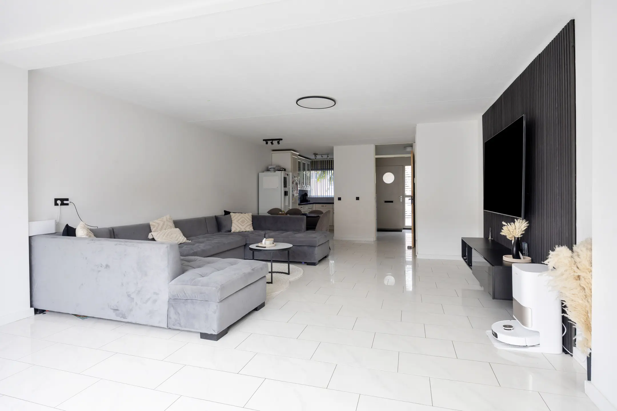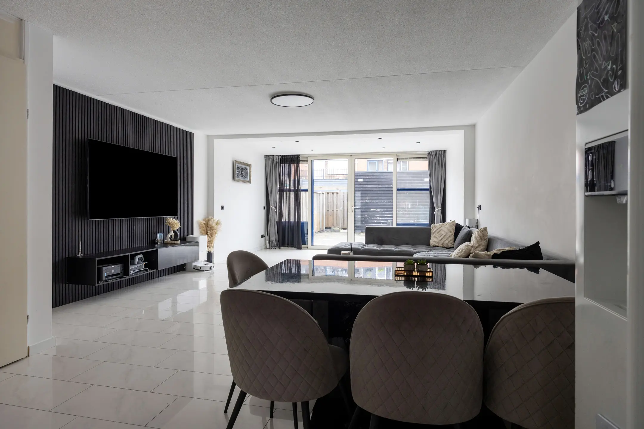 Via de entree komt u binnen in een verzorgde hal met toegang tot het luxe toilet, de trapopgang en het leefgedeelte. De begane grond is ingericht als een open en lichte woonlaag, waarbij de woonkamer aan de achterzijde is gesitueerd. Grote raampartijen en de schuifpui zorgen hier voor prettig daglicht en een directe verbinding met de tuin. Aan de voorzijde bevindt zich de keuken, opgesteld in een praktische U-vorm en uitgevoerd met diverse inbouwapparatuur, waaronder een inductiekookplaat, afzuigkap, dubbele combi-oven, vaatwasser en koelkast. Tussen wonen en koken is ruimte voor een royale eethoek, waardoor deze verdieping uitnodigt tot samenkomen zonder dat het open karakter verloren gaat.