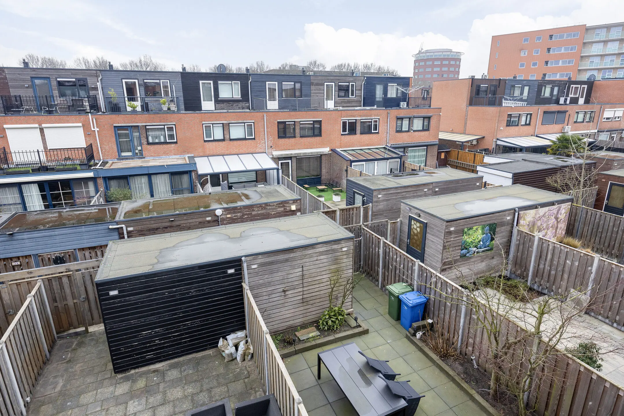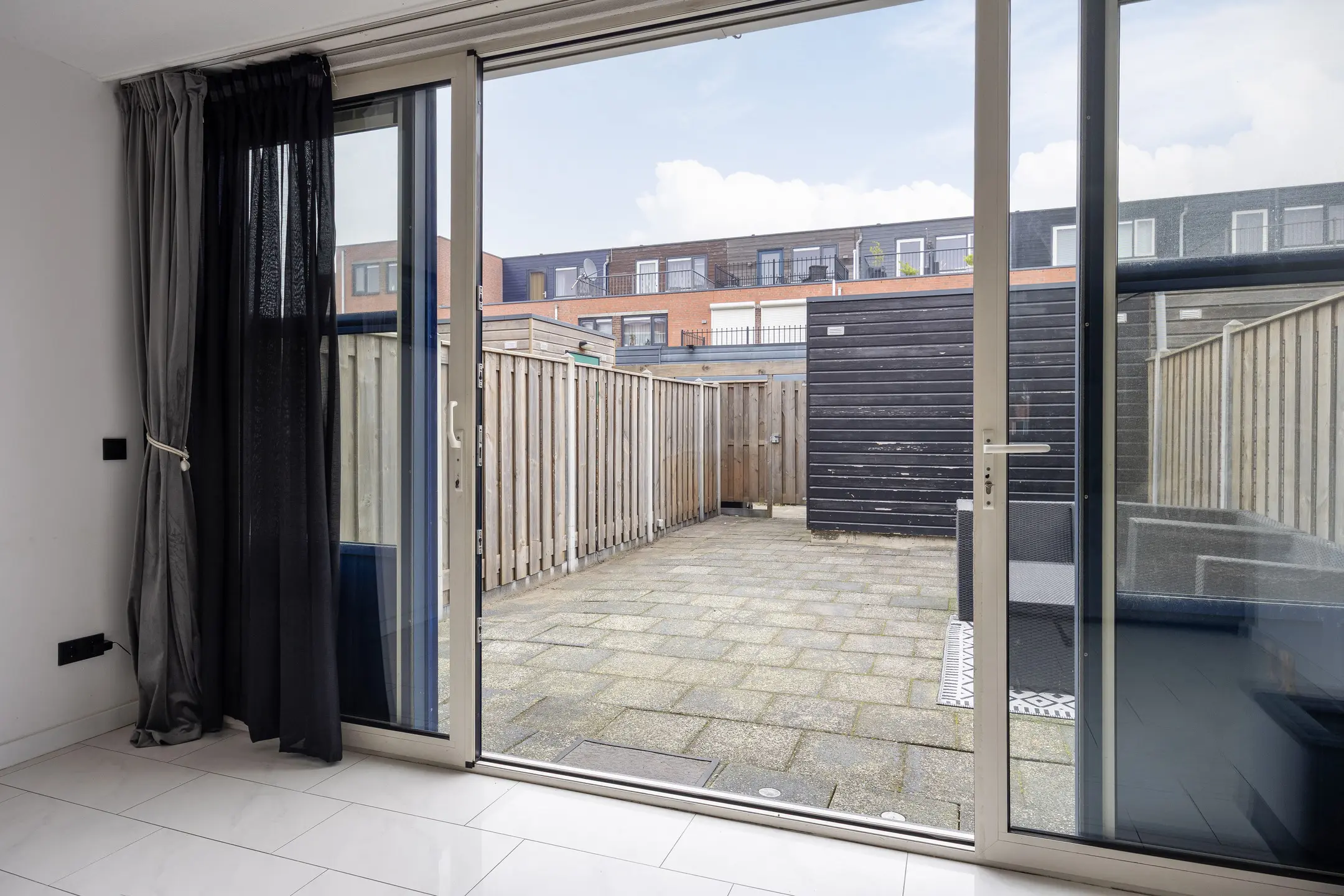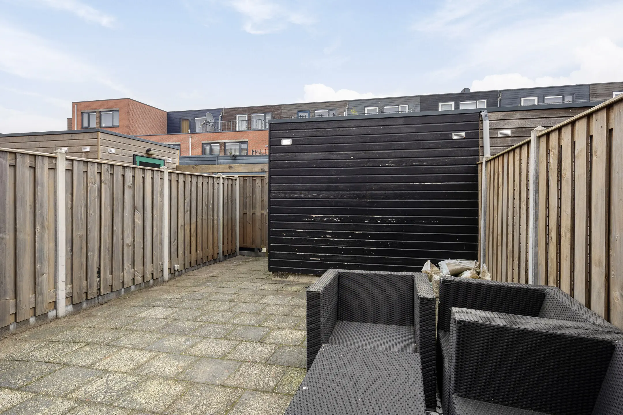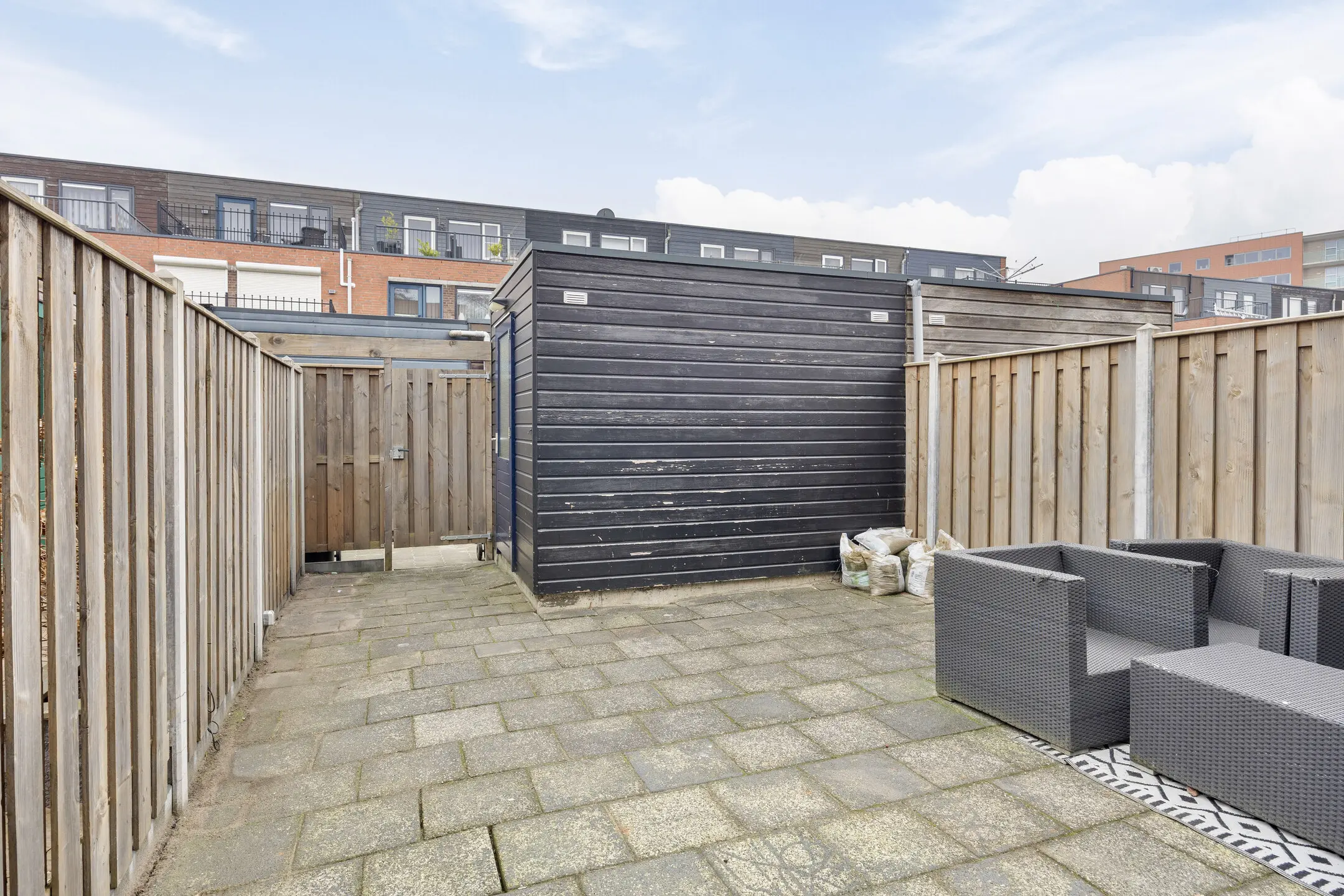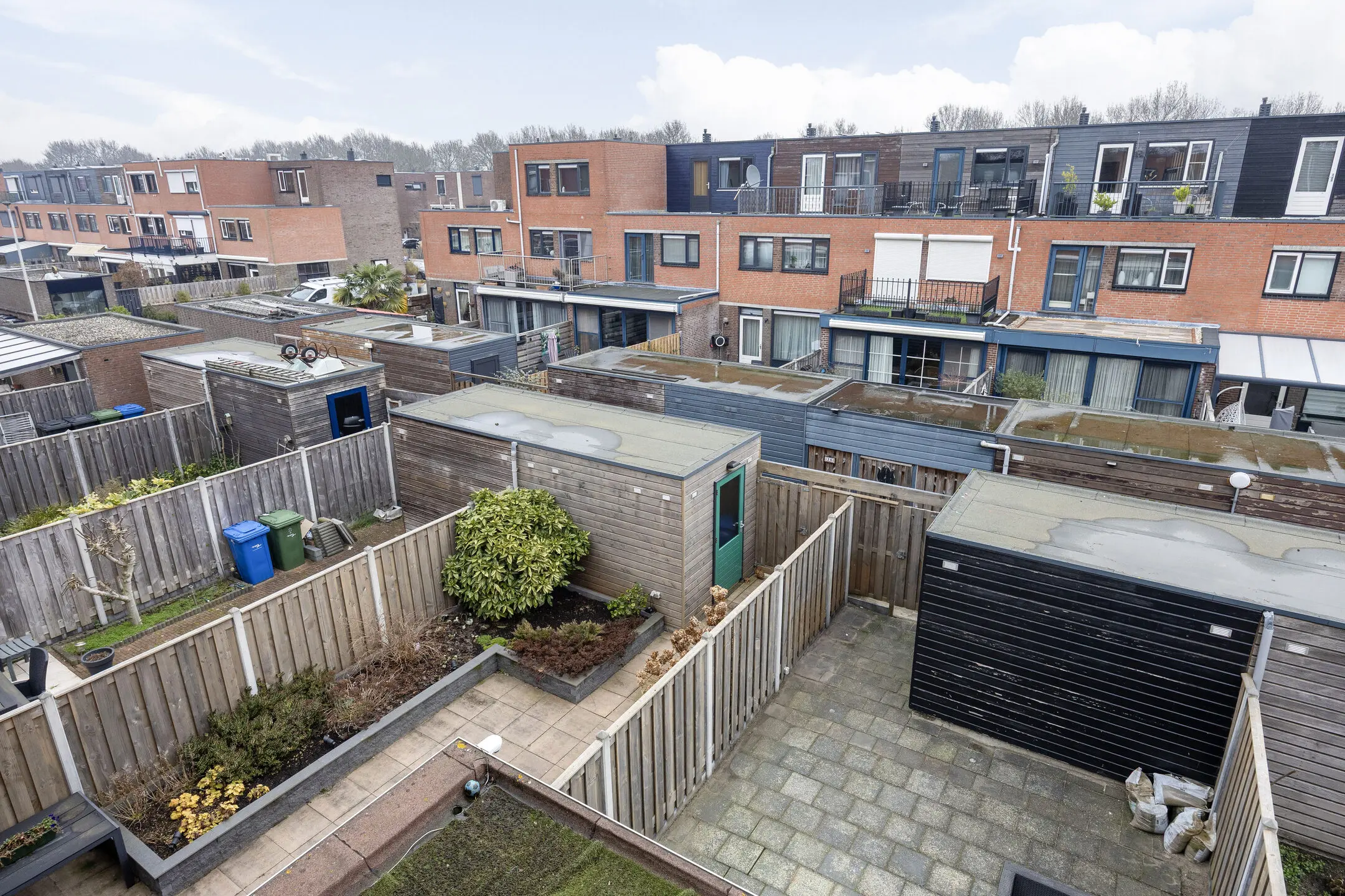 De achtertuin is onderhoudsvriendelijk aangelegd en biedt voldoende ruimte voor een zitplek, een eettafel en groen naar eigen wens. Door de ligging aan de achterzijde geniet u hier van privacy en rust, terwijl de tuin direct bereikbaar is vanuit de woonkamer. Een praktische berging zorgt voor extra opslagruimte en is ideaal voor fietsen en tuinspullen. Er is tevens een achterom aanwezig voor handige toegang.