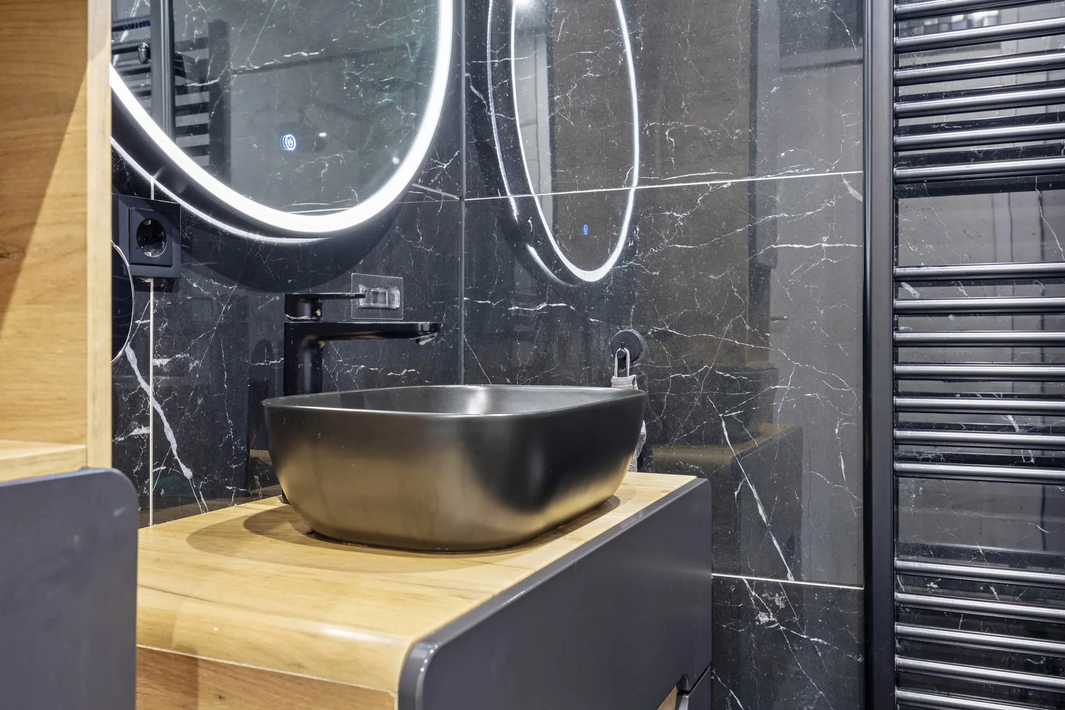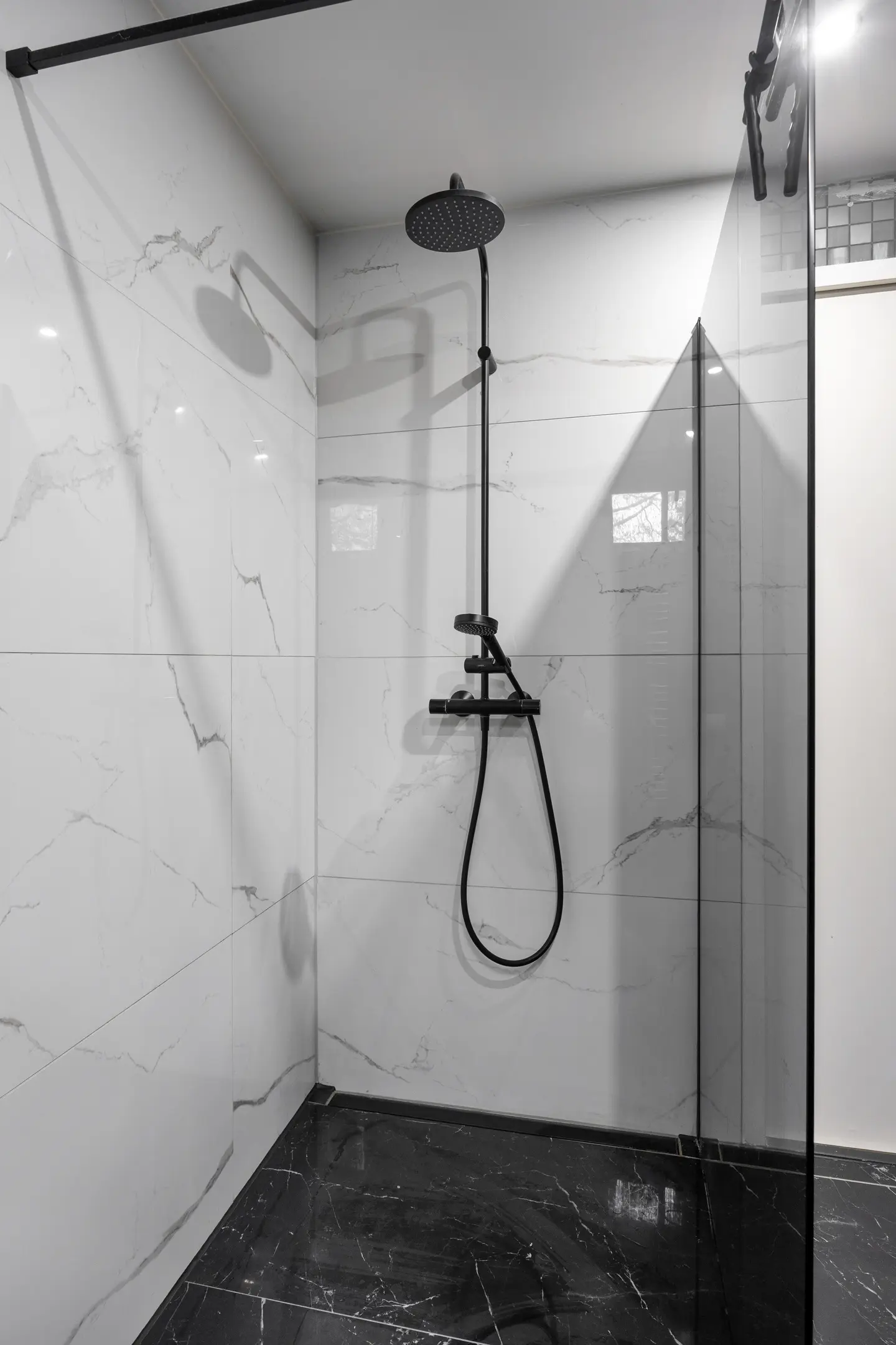 Op de eerste verdieping bevinden zich drie slaapkamers en de badkamer. De kamers zijn stuk voor stuk functioneel van formaat en flexibel in te delen, bijvoorbeeld als slaap-, werk- of hobbyruimte. Via de hoofdslaapkamer, gelegen aan de achterzijde, is er toegang tot het platdak van de aanbouw. De badkamer is luxe uitgevoerd met lichte en donkere marmerlooktegels, gecombineerd met warme houtaccenten, en voorzien van een inloop-regendouche, wastafelmeubel met opzetkom, verlichte spiegel en wandcloset. Deze verdieping is praktisch opgezet en sluit goed aan op de wensen van een gezin of een combinatie van wonen en werken aan huis.